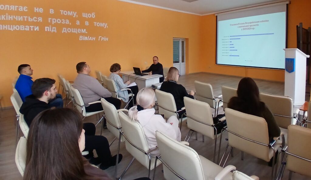 Згідно з порядком денним, перше питання було присвячене підбиттю підсумків І етапу Всеукраїнської учнівської олімпіади з математики у 2025/2026 навчальному році. Консультант Центру Олег Ставінський здійснив ґрунтовний аналіз результативності учасників, окреслив рівні навчальних досягнень здобувачів освіти та визначив ключові проблемні зони у підготовці учнів до інтелектуальних змагань.